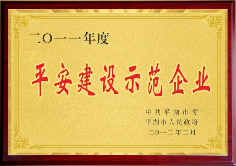 繼集團(tuán)公司被嘉興市社會(huì)治安綜合治理委員會(huì)命名為“2011-2012年度示范綜治工作站 ”稱(chēng)號(hào)后, 日前,我集團(tuán)公司又被平湖市人民政府授予“2011年度平安建設(shè)示范企業(yè)”榮譽(yù)稱(chēng)號(hào)。