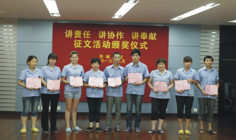 為弘揚和繁榮華城企業(yè)文化,引導(dǎo)廣大員工積極參與文化建設(shè),展現(xiàn)員工朝氣蓬勃、昂揚向上的精神風(fēng)貌,日前,集團總部開展了“講責(zé)任、講協(xié)作、講奉獻”主題征文活動。經(jīng)過總部周密安排和宣傳發(fā)動,征文活動得到了集團各分廠、各部門和全體員工的積極響應(yīng),共收到稿子70余篇。為體現(xiàn)公正公平原則,本次活動特邀請平湖文化館吳紹樓老師做評委,經(jīng)過吳老師仔細閱讀,認真評選,共評出一等獎1名,二等獎3名,三等獎6名,鼓勵獎56名。8月3日,總部為獲獎員工舉行頒獎儀式,并且送上精心準(zhǔn)備的獎品。