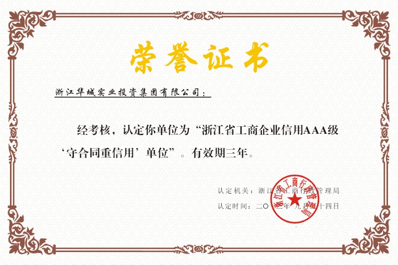 浙江華城實業(yè)投資集團有限公司再次被認定為“浙江省工商企業(yè)信用AAA級 ‘守合同重信用’單位