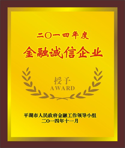 為進一步推進落實“信用平湖”建設(shè)工作,構(gòu)建良好銀企環(huán)境,促進經(jīng)濟持續(xù)健康發(fā)展,平湖市人民政府金融工作領(lǐng)導(dǎo)小組組織開展了“金融誠信企業(yè)”評選活動,我公司被授予“2014年度金融誠信企業(yè)”光榮稱號。