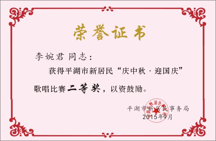 為活躍節(jié)日氣氛,豐富新居民精神文化生活, 9月20日下午,平湖市新居民事務(wù)局在平湖市文化館組織開展了新居民“慶中秋·迎國慶”歌唱比賽,我集團(tuán)公司下屬華城衣歌路員工李婉君榮獲了本次歌唱比賽二等獎,充分展現(xiàn)了我公司新居民員工良好的精神風(fēng)貌和藝術(shù)素養(yǎng)。