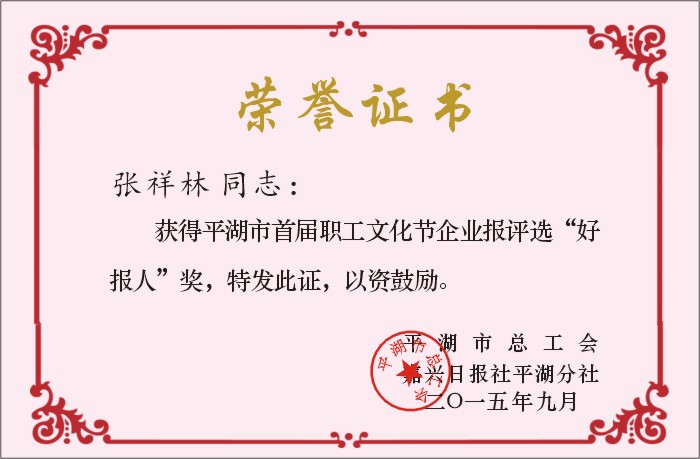 為促進企業(yè)報發(fā)展,推動企業(yè)文化建設(shè),日前,平湖市總工會與嘉興日報社平湖分社聯(lián)合舉辦了平湖市首屆職工文化節(jié)暨企業(yè)報“三好”評選活動,我公司董事長張祥林榮獲平湖市首屆職工文化節(jié)企業(yè)報評選“好報人”稱號。