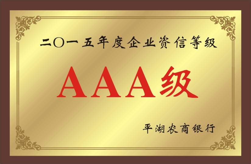 企業(yè)資信等級一等資信狀況包括三個資信級別,即AAA級、AA級和A級!癆AA”表示企業(yè)經(jīng)營處于良性循環(huán)狀態(tài),資產(chǎn)質(zhì)量優(yōu)良,經(jīng)營業(yè)績好,支付能力很強,信譽極好,清償能力非常強,風險最小,是資信等級中的最高級別。我公司近日又獲平湖農(nóng)商銀行2015年度AAA級企業(yè)資信等級證書。