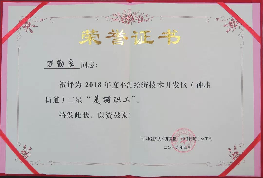 華城衣歌員萬(wàn)勤良榮獲在平湖經(jīng)濟(jì)技術(shù)開(kāi)發(fā)區(qū)“星級(jí)三美”爭(zhēng)創(chuàng)活動(dòng)中被評(píng)為二星“美麗職工”稱號(hào)。