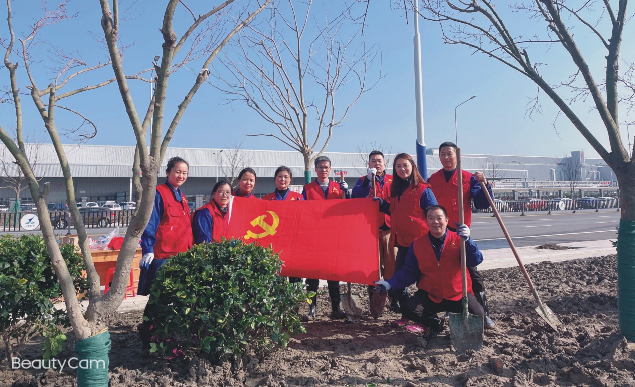 當(dāng)日早上8:30在陳書記的帶領(lǐng)下,一支由四男六女共十人組成的志愿隊(duì)從公司出發(fā),大概十分鐘左右的車程,到達(dá)了此次植樹活動(dòng)的目的地,即長(zhǎng)城汽車公司路段。考慮到泥地濕滑,書記已貼心地為每個(gè)人提前準(zhǔn)備好了雨鞋,換上雨鞋、穿上紅馬夾、戴上紗手套、抓起鐵鍬,為接下來(lái)的勞動(dòng)做好了預(yù)熱準(zhǔn)備。我們的隊(duì)伍徑直走到了自己的包干區(qū),看著周圍一群群同樣穿著紅馬夾的其他公司的志愿者們,一腔勞動(dòng)的熱血馬上涌上心頭,二話不說(shuō),拿鐵鍬的伙伴們?cè)缫衙闇?zhǔn)了那個(gè)事先定位好的樹坑,圍著坑一鏟一鏟地開始挖土。我們先選了小的灌木下手,所以十人的隊(duì)伍自覺地分成了兩個(gè)小分隊(duì),有的挖土,有的抬樹,還有的在一旁用相機(jī)記錄下這激情時(shí)刻,可謂一派熱火朝天的景象。種好了灌木,我們十人組合開始齊心協(xié)力應(yīng)對(duì)那幾棵大樹,相比灌木而言,需要把坑挖得更大些,抬樹也需要更多的力氣,因?yàn)橄闩輼渖砩祥L(zhǎng)刺,無(wú)法接觸樹的上部,只能靠接觸樹干下部有布包住的位置用力。此時(shí)男同胞們充分發(fā)揮了他們的男性力量,兩三人同時(shí)用力,再加上一兩人拉起樹根的捆繩,終于穩(wěn)穩(wěn)地將樹放置到挖好的坑中。將樹放正后女同胞們扶住樹干,男同胞們拿起鐵鍬鏟土填坑,扶樹的女同胞們手沒空,腳也沒有閑著,抽出一只腳,用力地踩著填上來(lái)的泥土,讓每一鏟土都準(zhǔn)確地到它該去的地方,發(fā)揮其應(yīng)有的作用。一會(huì)兒功夫,一棵大樹就亭亭玉立地出現(xiàn)在了眾人的面前。