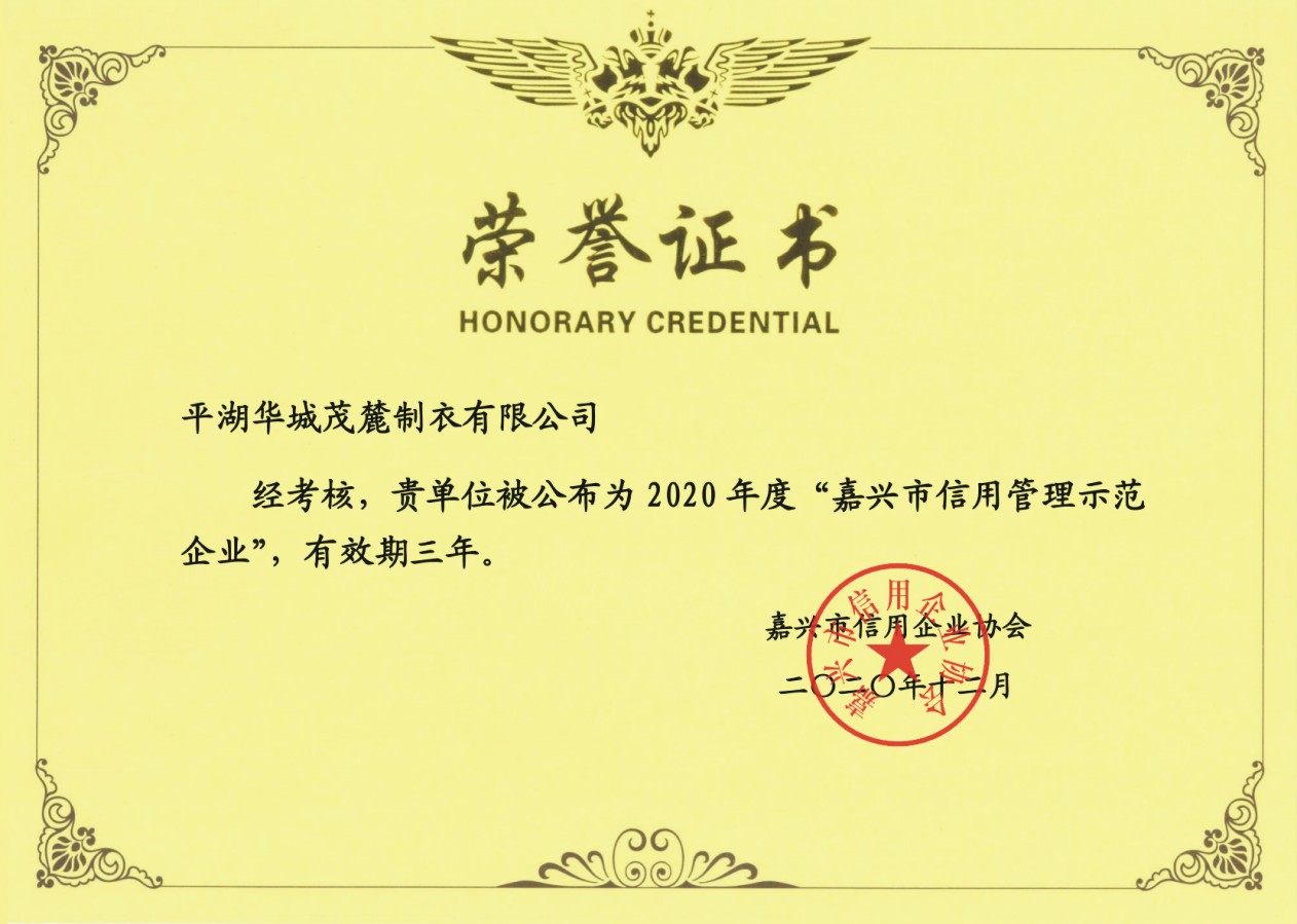誠(chéng)信思想決定企業(yè)方向,誠(chéng)信力量推動(dòng)企業(yè)發(fā)展。繼榮獲嘉興市級(jí)誠(chéng)信守法示范企業(yè)之后,我公司近日又接喜訊,在嘉興市信用企業(yè)協(xié)會(huì)公布的2020年度“嘉興市信用管理示范企業(yè)”名單上,平湖華城茂麓制衣有限公司榮列其中。