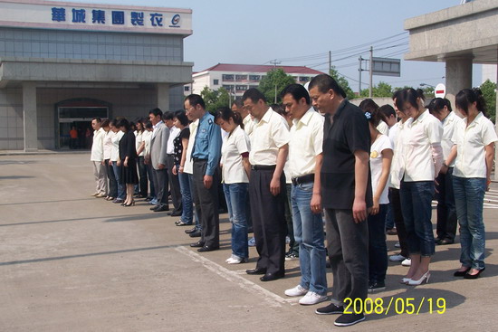 國(guó)旗低垂,汽笛長(zhǎng)鳴,山河齊悲,舉國(guó)同哀。5月19日14:28,在這全國(guó)哀悼汶川死難者的肅穆時(shí)刻,平湖市常務(wù)副市長(zhǎng)石云良、市政協(xié)主席陸致遠(yuǎn)與華城員工一起在華城大樓前廣場(chǎng),面對(duì)降半旗的五星紅旗,朝著四川災(zāi)區(qū)方向,默哀3分鐘。