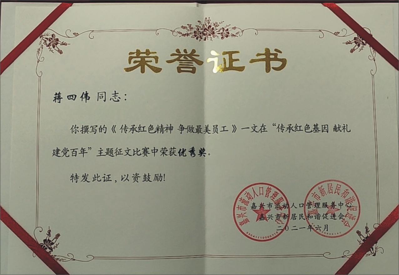 在建黨百年到來之際,嘉興市流動人口管理服務(wù)中心及嘉興市新居民和諧促進會組織舉辦了“傳承紅色基因•獻禮建黨百年”主題征文比賽。我公司員工蔣四偉以《傳承紅色精神•爭做最美員工》一文獲得征文比賽優(yōu)秀獎。此次嘉興市征文比賽,平湖僅有2人獲獎,足以證明這個獎項具有一定的含金量。