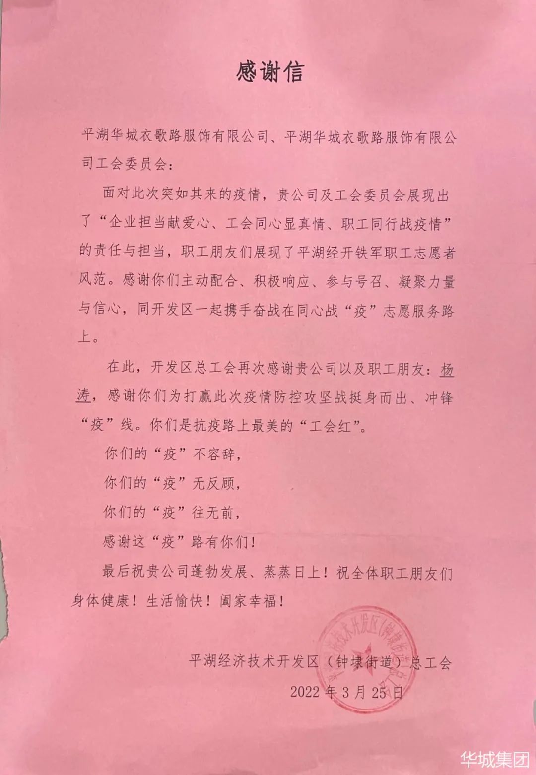 當(dāng)前位置:首頁 > 華城動(dòng)態(tài)日前,一封來自平湖經(jīng)濟(jì)技術(shù)開發(fā)區(qū)(鐘埭街道)總工會(huì)的感謝信,被送到了華城衣歌路。