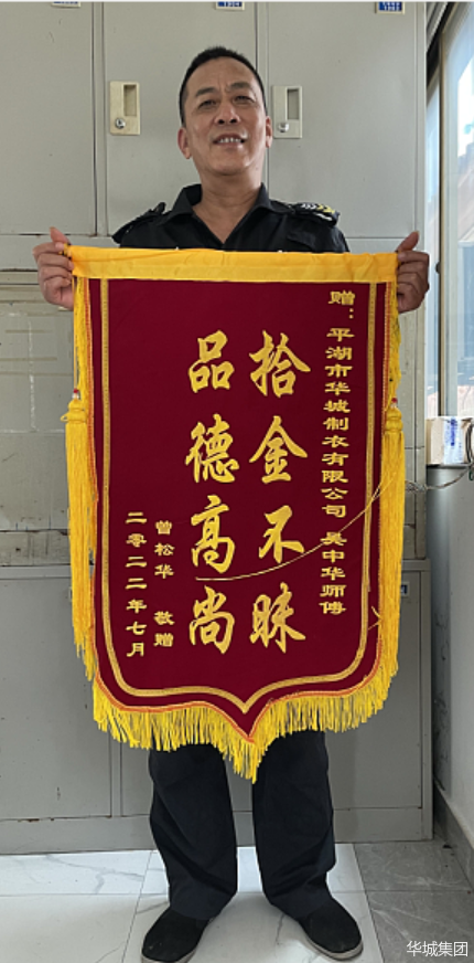 當(dāng)?shù)玫较⒌脑扇A急匆匆趕來,捧著失而復(fù)得的包時(shí),心里的激動無法表達(dá)。一定要向吳中華當(dāng)面酬謝,吳中華堅(jiān)決拒絕。包包找到失主,他同樣開心不已。為了表達(dá)衷心的謝意,隔日,曾松華又來到華城制衣,向吳中華送上“拾金不昧,品德高尚”錦旗。