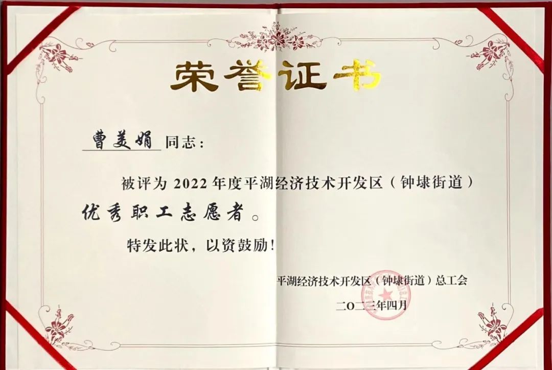平湖華城茂麓制衣有限公司員工曹美娟榮獲“2022年度平湖經(jīng)濟(jì)技術(shù)開發(fā)區(qū)(鐘埭街道)優(yōu)秀職工志愿者”稱號;