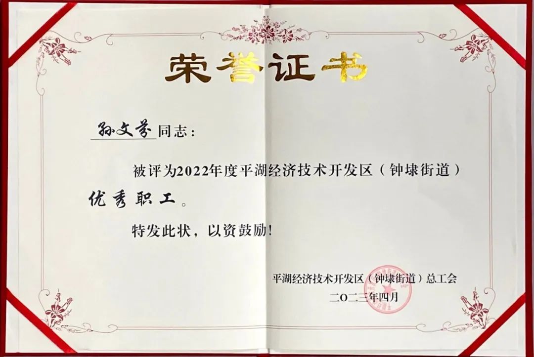平湖市華城制衣股份有限公司員工孫文芬榮獲“2022年度平湖經(jīng)濟(jì)技術(shù)開發(fā)區(qū)(鐘埭街道)優(yōu)秀職工”稱號;