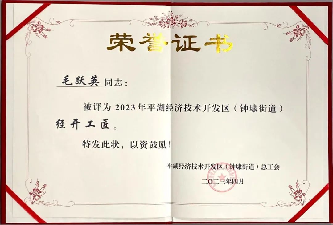 平湖華城茂麓制衣有限公司員工毛躍英榮獲“2023年平湖經(jīng)濟(jì)技術(shù)開發(fā)區(qū)(鐘埭街道)經(jīng)開工匠”稱號。