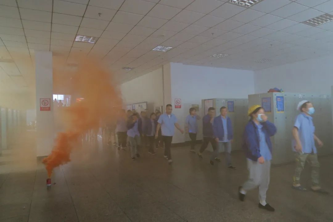 演習(xí)開始后,微型消防站成員在現(xiàn)場放起煙霧彈,模擬火災(zāi)現(xiàn)場。行政部童部長按照預(yù)定的計劃,發(fā)出緊急疏散指令,全員迅速按照演習(xí)方案進行疏散,有序地從通道向安全出口模擬逃生。在演習(xí)過程中,彭部長對員工的表現(xiàn)進行了評估,并及時提出了改進意見。
