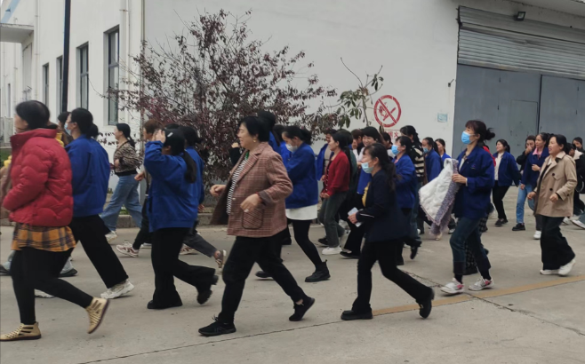 隨著一陣急促的警報聲響起,疏散演練正式開始。全體員工按照演練預(yù)案開展了火場逃生演習(xí)。同事們紛紛掩住口鼻,壓低姿勢彎著腰,安全、快速、有序地逃出生產(chǎn)車間,到達指定的安全地點。