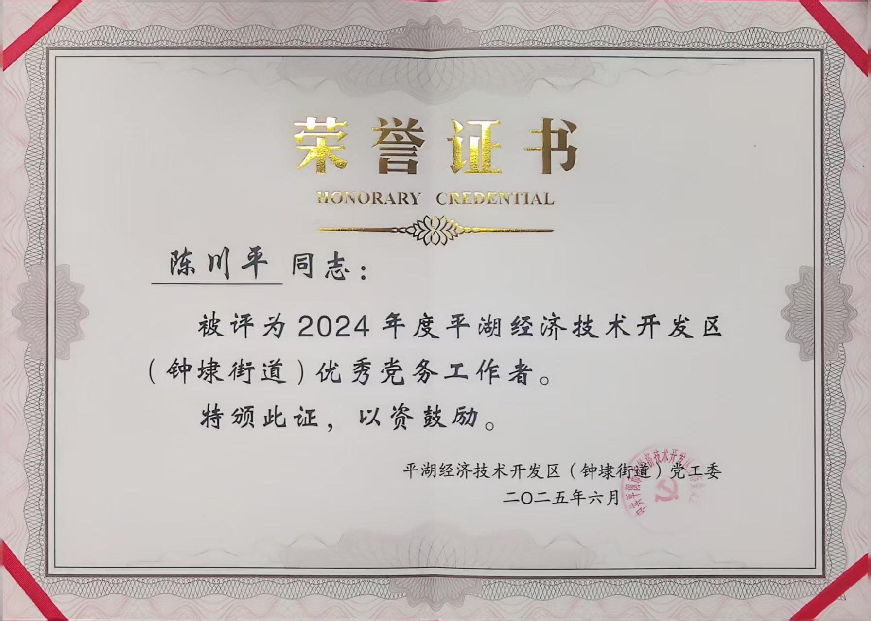 華城集團(tuán)黨委副書記陳川平榮獲“2024年度平湖經(jīng)濟(jì)技術(shù)開發(fā)區(qū)優(yōu)秀黨務(wù)工作者”稱號(hào)。