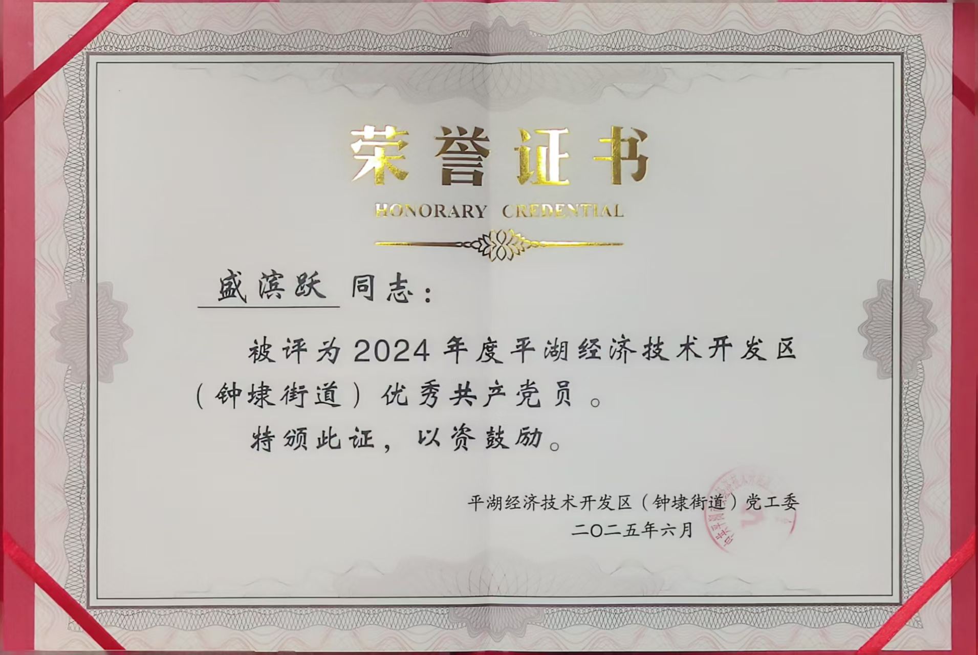 締雅服裝黨支部盛濱躍榮獲“2024年度平湖經(jīng)濟(jì)技術(shù)開發(fā)區(qū)優(yōu)秀共產(chǎn)黨員”稱號(hào)。
