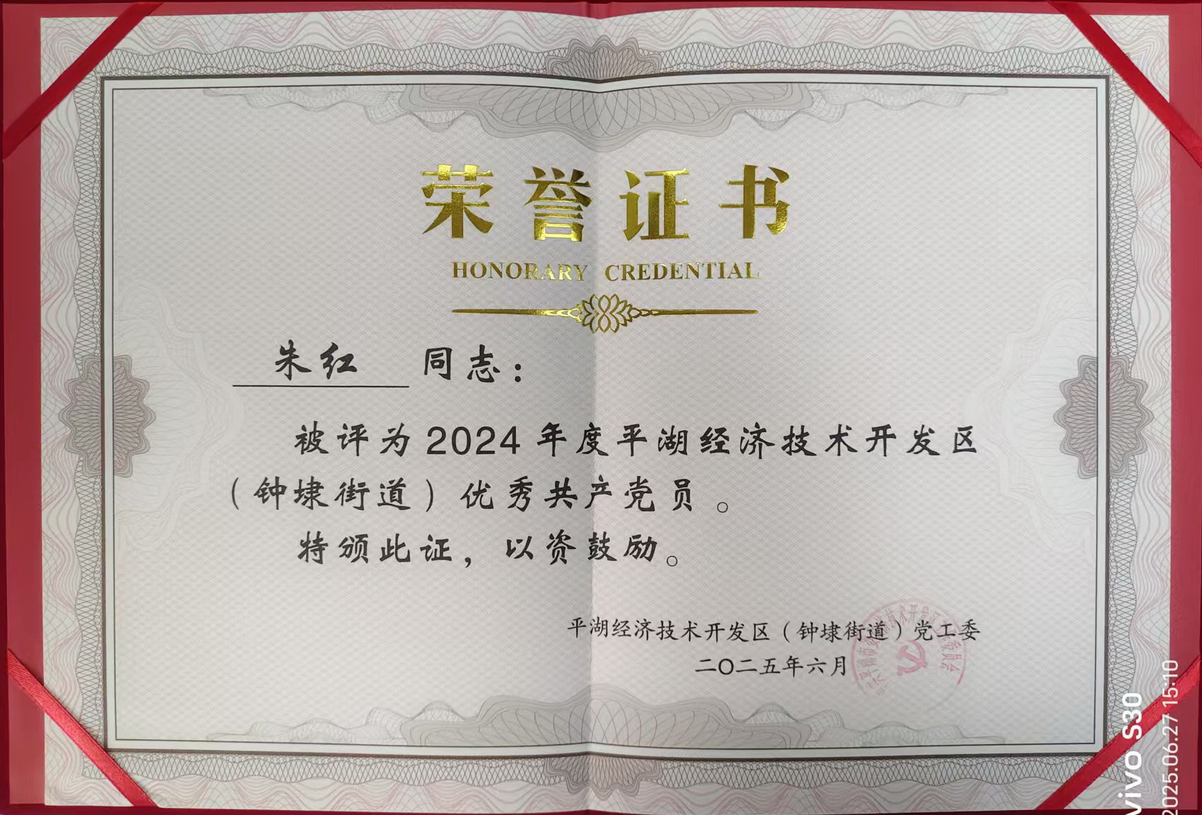 華城制衣黨支部朱紅榮獲“2024年度平湖經(jīng)濟(jì)技術(shù)開發(fā)區(qū)優(yōu)秀共產(chǎn)黨員”稱號(hào)。